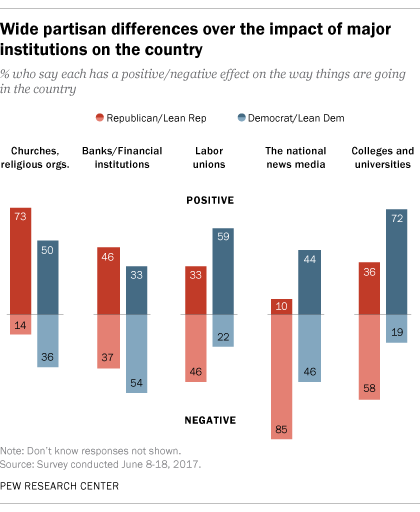 While Democrat views on the impact of the national news media have grown more positive, Republicans have grown even more negative in their assessment of the media. There’s a big disparity in views over most major institutions. The difference is most striking when you look at the media, where only 10% of Republicans have a positive view.