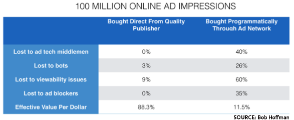 Dr. Augstine Fou looked at 100 million online ads. His conclusion is that only 11.5 cents of every dollar actually put an ad in front of a consumer. That’s a lot of waste. Premium publishers, by comparison, delivered more than 88 cents of every dollar.
