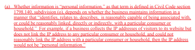 As in any piece of legislation and requirements, the devil is in the details. One of the key changes the CA AG wants has to do with the definition of what constitutes personal information — one of the key components of CCPA. The changes, according to the AG’s office, more clearly defines personal info as data that relates to a particular person. In other words, it’s OK to collect information as long as it’s not identifiable to an individual. Here’s the marked-up copy of the proposal.