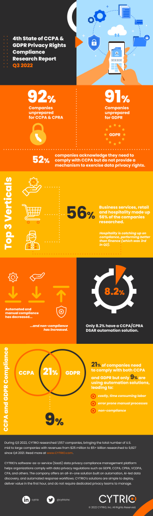 According to a study of nearly 10,000 companies, data privacy security company CYTRIO reports the marjority of companies have still not taken proactive measures to comply with the California Consumer Privacy Act (CCPA). CCPA and the enhanced CPRA becomes fully enforceable on January 1, 2023 and includes employees’ rights to their personal data.